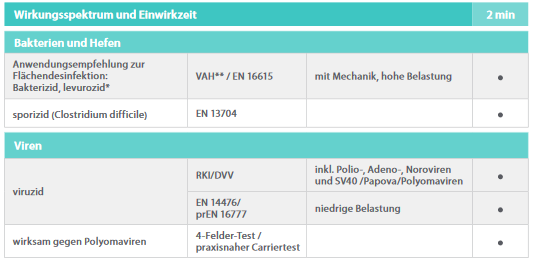 - Besonders geeignet zur Desinfektion von mittelgroßen Flächen in Bereichen mit erhöhter Wirksamkeitsanforderung